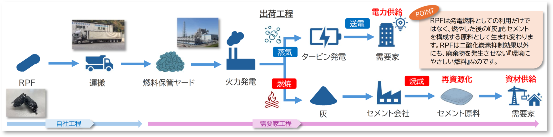 これまでRPFは製紙会社で主に使用されていましたが、国内でも化石燃料に頼らないエネルギー原料として化学メーカー、製鉄所などの発電燃料として使用されています。その他でも燃焼熱や蒸気の利用を目的とした温浴施設、牧場の暖房設備、染色工場など幅広い業種で化石燃料の代替燃料として利用されています。RPFはこれからの脱炭素社会に向けて大きく貢献する燃料として注目されています。